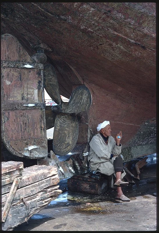 #87, Man sitting under Ship, Essaouira, Morocco, M